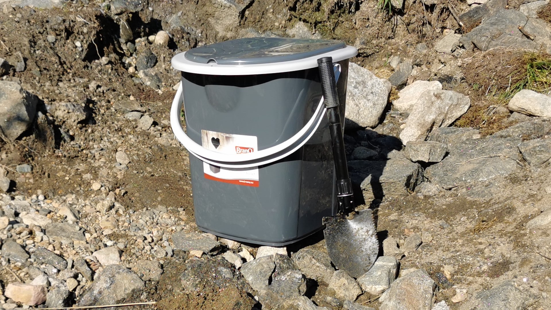 Wir haben uns für eine leicht abgewandelte Form einer faltbaren Toilette entschieden: Einen Eimer, dessen Deckel eine Klobrille imitiert. Zubehör wie Toilettenpapier, Beutel und Klappspaten haben wir während der Reise dann einfach darin verstaut.