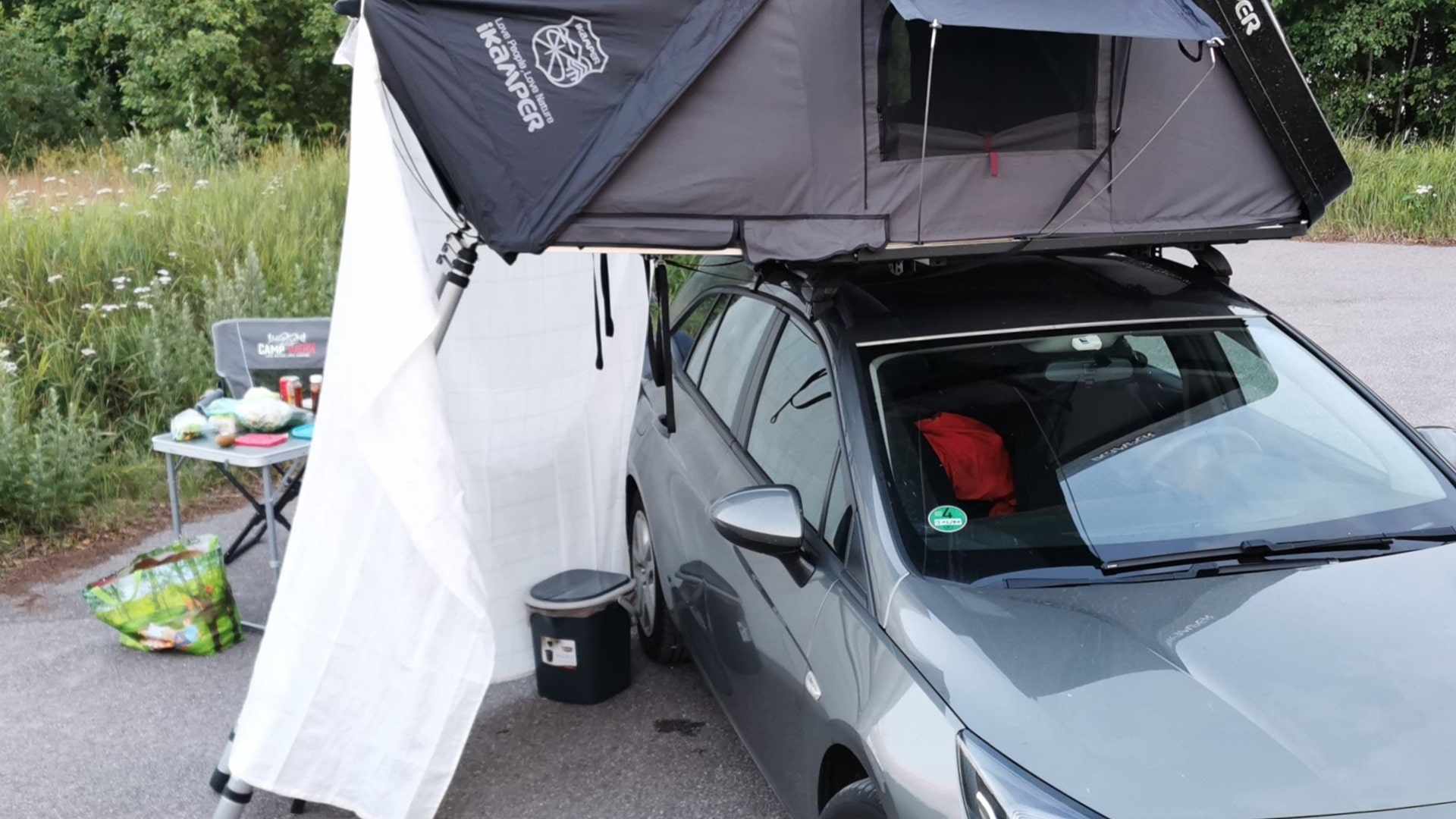 Eine einfache, platzsparende, allerdings optisch nicht ganz ansprechende Lösung ist ein Duschvorhang, der unter dem Dachzelt eingeklippt wird. Auf unserer letzten Reise hat sich diese Wahl bewährt – wir brauchten ihn nur einmal und hatten minimalen Stauraumverbrauch.