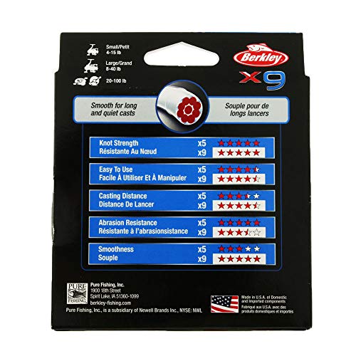 Die Berkley X9 Braid ist eine 9-fach geflochtene Schnur, die aus neun einzelnen Strängen besteht. Dadurch ist sie besonders rund geflochten und weist eine hohe Festigkeit, Geschmeidigkeit und Abriebfestigkeit auf.