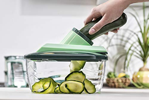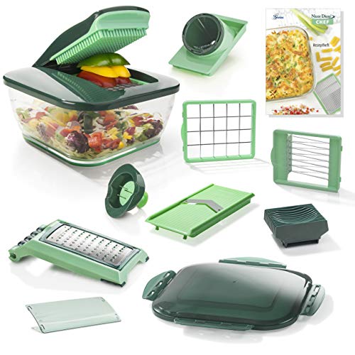 inkl. 19% gesetzlicher MwSt.Zuletzt aktualisiert am: 30. Januar 2026 03:37Der Nicer Dicer ist die ideale Küchenhilfe zum Zerkleinern von Obst und Gemüse. Verschiedene Aufsätze ermöglichen das Schneiden in Scheiben-, Streifen-, Stift-, Würfel- oder Juliettiform. Der Tomaten-Gemüse-Schneider ist optimiert auf besonders weiche Lebensmittel wie Tomaten, Pilze, Mozarella oder gekochte Eier. Der Nicer-Dicer ermöglicht blitzschnelles und variantenreiches Zuschneiden auf Restaurant-Niveau – und das komplett ohne Strom! Die Klingen sind aus rostfreiem Edelstahl und dank integriertem Selbstreinigungsmechanismus ist das Schneideset extrem pflegeleicht.