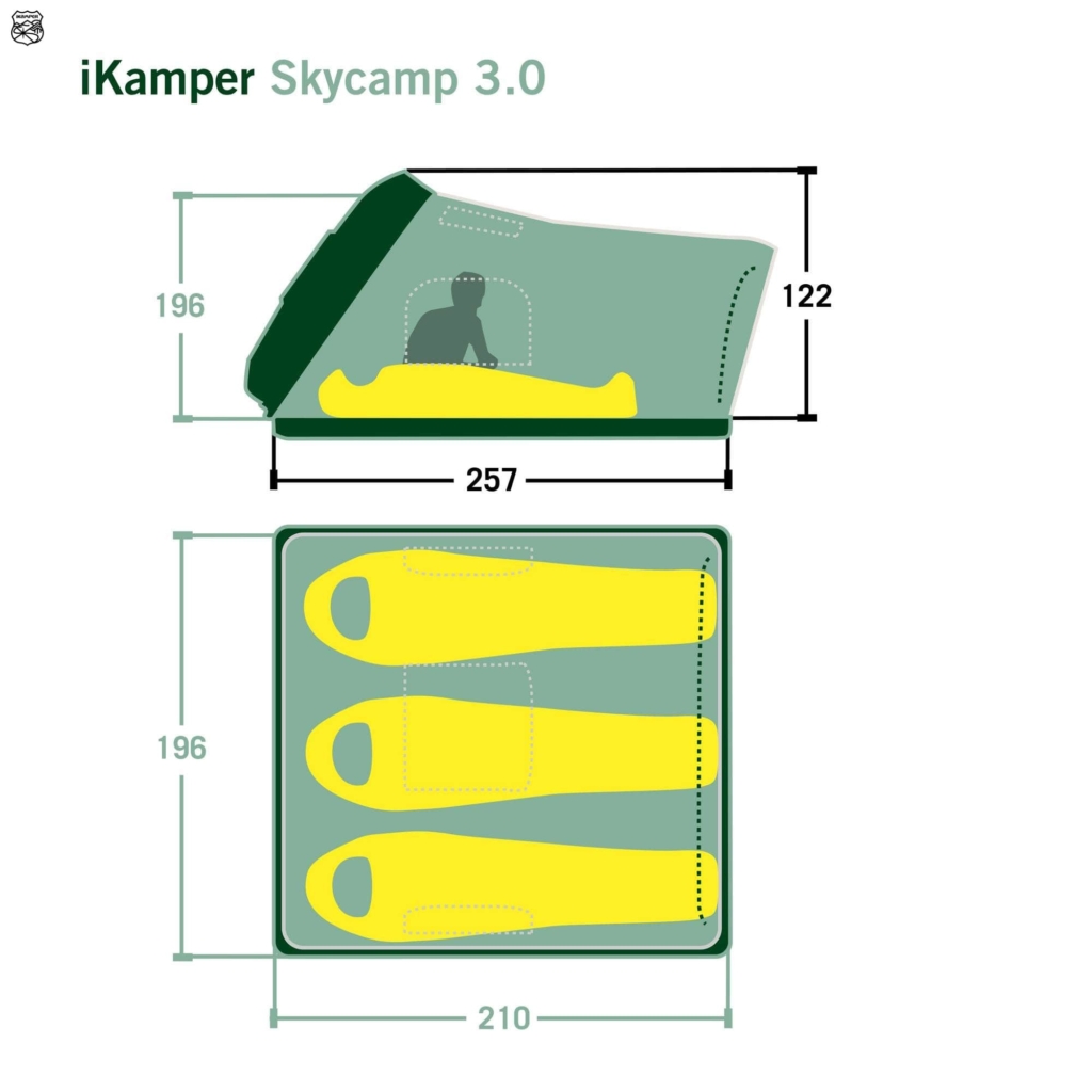 Das Skycamp 3.0 ist, der große Bruder des Skycamp 3.0 Mini von iKamper. Bis zu vier Personen, also die ganze Familie, kann hier auf einer Grundfläche von 210 x 196cm bequem schlafen. Es gibt kein anderes Hartschalen-Dachzelt, das so geräumig ist. Zusammengeklappt hat die Hartschale Außenmaße von 217 x 140 x 33cm. Damit ist es besonders für Kombis oder Minivans interessant. Das mit 74kg sehr niedrige Eigengewicht für diese Größe bleibt knapp unter der maximalen dynamischen Dachlast von 75kg, durch die viele Fahrzeuge limitiert werden. Vielleicht ist sie bei deinem Fahrzeug sogar höher, dann kannst du problemlos noch Schlafsäcke, Kissen und Schlafbekleidung im zusammengeklappten Zelt mitzuführen und damit wertvollen Platz im Kofferraum sparen. Check das einfach im Handbuch deines Autos.