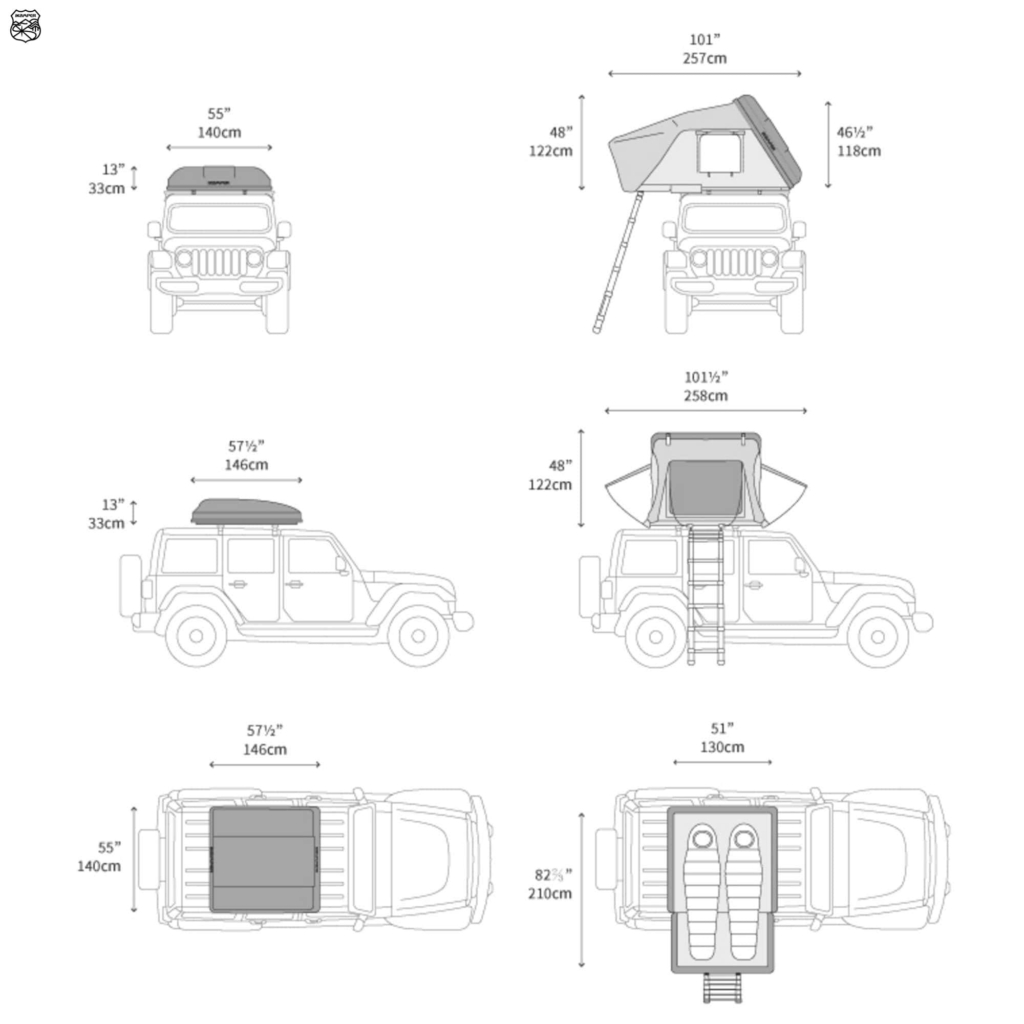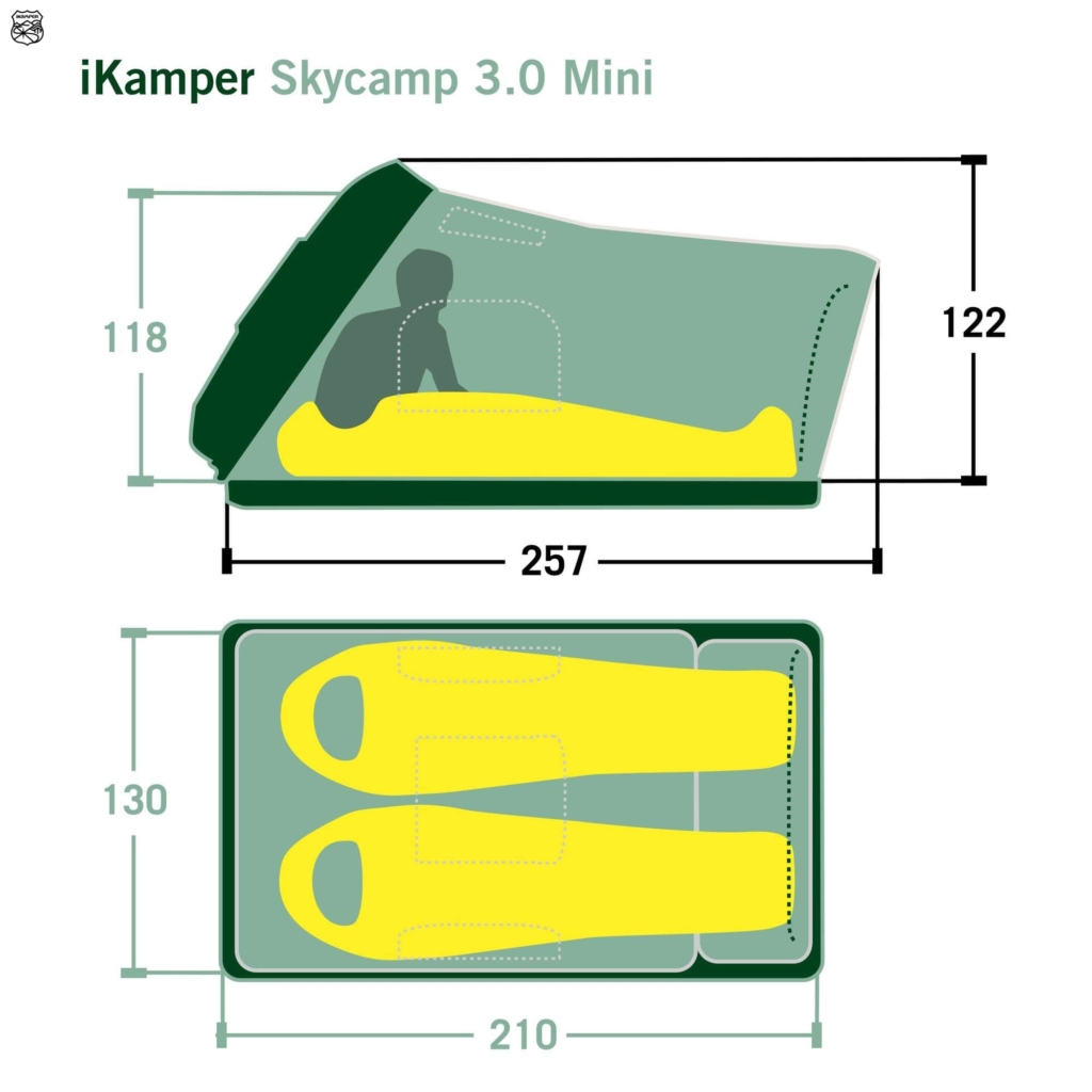 Das Skycamp 3.0 Mini ist, wie der Name schon sagt, etwas kleiner als das Skycamp 3.0 von iKamper. Mit einer Grundfläche von 210 x 130cm bietet es immer noch ausreichend Schlaffläche für 2 Personen. Zusammengeklappt hat die Hartschale Außenmaße von 146 x 140 x 33cm. Das macht das Skycamp 3.0 Mini sogar für Kleinwagen, Fließhecklimousinen oder Ladeflächen von Pick-Ups nutzbar. Das mit 58kg enorm niedrige Eigengewicht bleibt deutlich unter der maximalen dynamischen Dachlast von 75kg, durch die viele Fahrzeuge limitiert werden. Das ermöglicht es, Schlafsäcke, Kissen und Schlafbekleidung im zusammengeklappten Zelt mitzuführen, ohne die Gewichtsgrenze zu überschreiten.