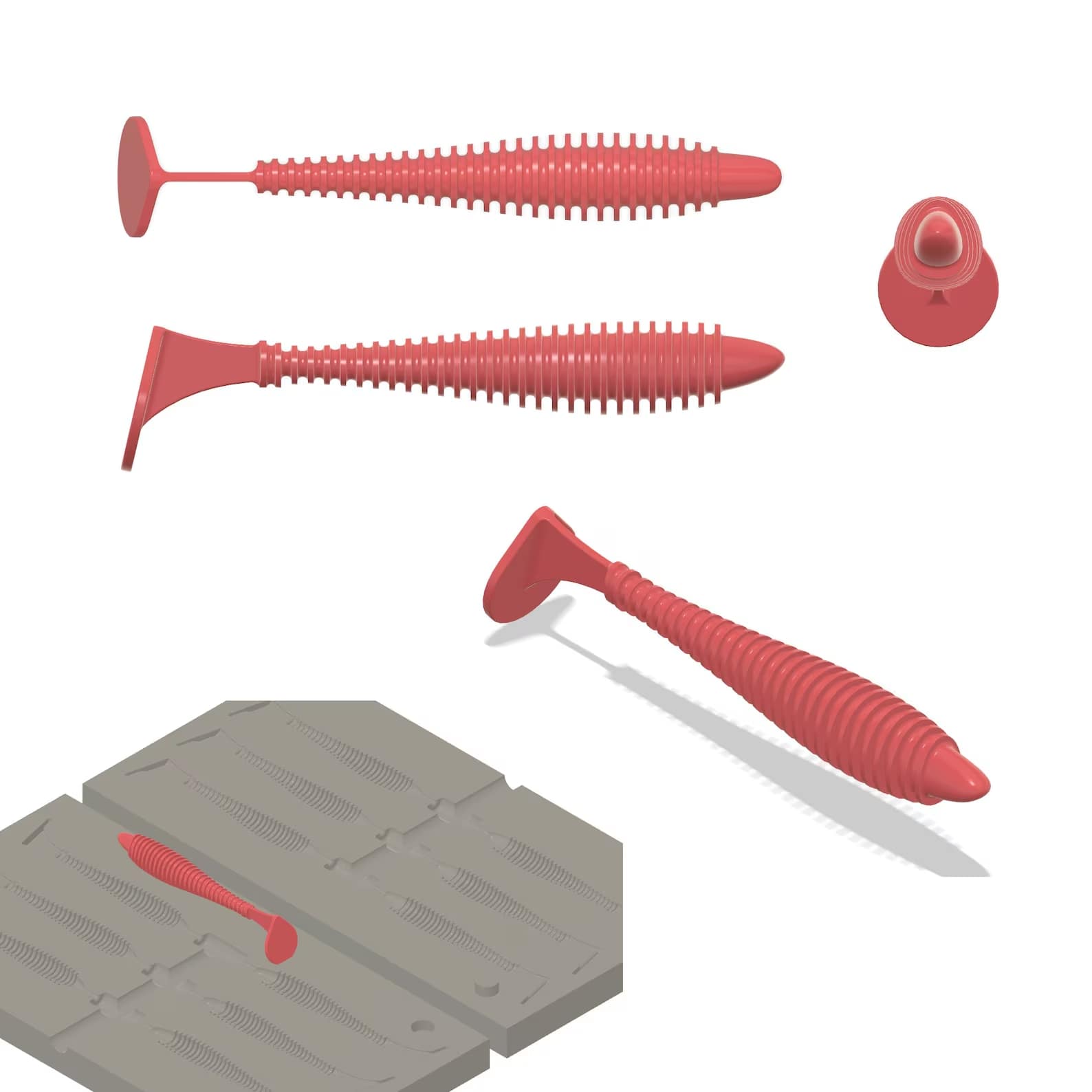 Die hier vorgestellte Datei enthält Gussformen für Gummiköder, die dem Mold Swing Impact in der Größe 3,8 Zoll nachempfunden ist. Die Form beinhaltet 6 Gussnester. Eine Schritt-für-Schritt-Anleitung zur Herstellung eigener Gussformen und Gummifische findest du im Artikel Gummifische gießen DIY – Eine Hospitation in Kevelaer. Hier wird auch erklärt, welcher 3D-Drucker und welches Resin geeignet sind, um eine Gussform zu erstellen, die den hohen Temperaturen des flüssigen Plastisols standhält.