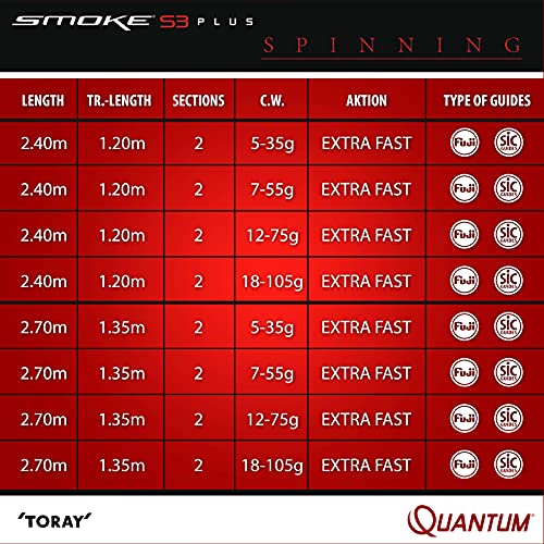 Die Quantum Smoke S3 Plus präsentiert sich insgesamt als langlebige, hochwertig verarbeitete Rutenserie der absoluten Extraklasse. Vertraue auf Design und Technik auf höchstem Niveau und lass dich von der Leistungsfähigkeit dieser Rute begeistern – und das in einer hervorragenden Preisklasse!