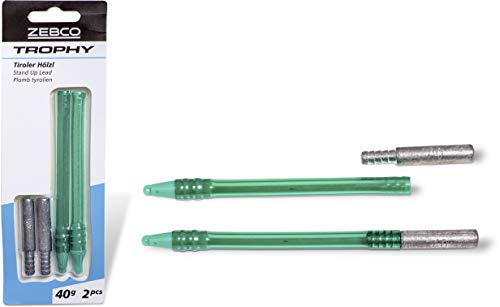 3,74 € Tiroler Hölzl sind eine stabförmige Gewichtsart für Laufbleimontagen. Sie stehen nahezu senkrecht auf dem Grund. Das untere Ende des Stabes bildet das Bleigewicht. Der obere Teil des Stabes ist ein mit Luft gefüllter Kunststoffschlauch. Durch das obere Ende kann die Schnur laufen. Diese Technik reduziert die Hängergefahr. Der Abstand zwischen Bleigewicht und Schnurlauf verhindert außerdem, dass das Gewicht beim Einsinken in einen schlammigen Untergrund das beköderte Vorfach mit sich zieht. Das Ergebnis ist eine perfekte Köderpräsentation über dem Grund. Dieses Paket umfasst 2 Tiroler Hölzl des Herstellers Zebco mit einem Gewicht von 80g.