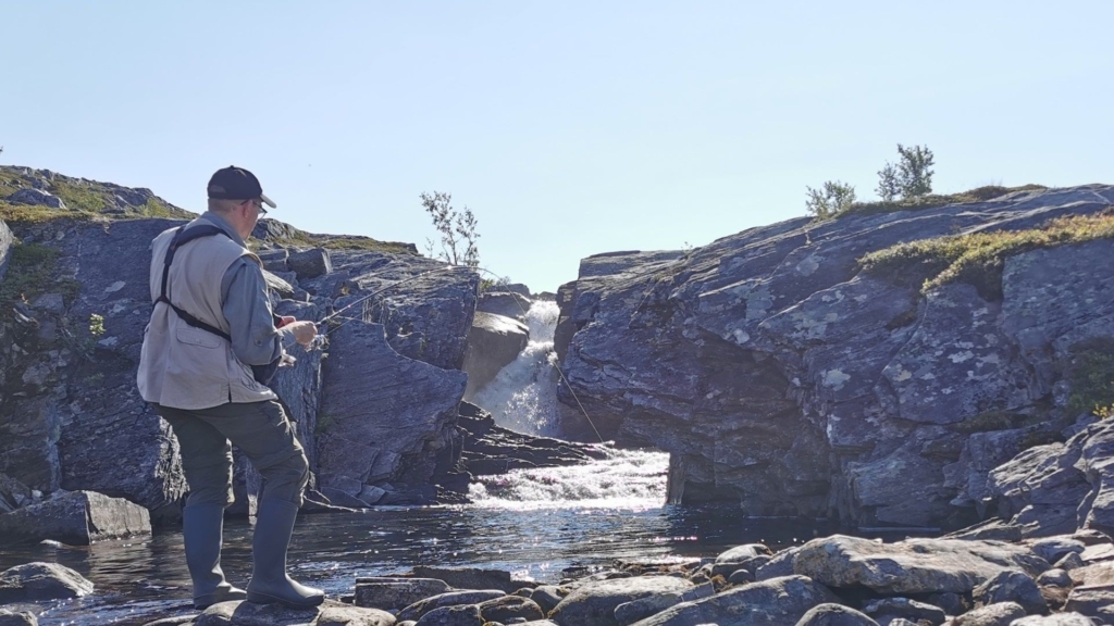An jenem Tag wurde es leider nix mehr. Die Würmer, die ich wie empfohlen etwa 5cm hinter dem Toby-Blinker an einem Einzelhaken laufen ließ, wurden zwar von einigen kleinen Forellen abgeknabbert, haken konnte ich allerdings keine davon. An anderen Tagen lief es etwas besser. Besonders in den tieferen Gumpen des Bachlaufes und an den Staumauern bissen ein paar knapp unter 30cm große Forellen und Saiblinge auf meinen 3er Mepps im Regenbogenforellendesign. Die Empfehlung eines Freundes aus der Gegend dort lautete: "Im Herbst, nach dem ersten Frost, sind die Mücken kaputt. Dann nimmt das Nahrungsangebot schnell drastisch ab und man hat gute Chancen, die hungrigen Salmoniden an den Haken zu bekommen." Wie dem auch sei, aufgrund des fantastischen Panoramas machst du bei den Bergseen am Sportplatz von Hammerfest nie etwas verkehrt und nimmst selbst an einem Schneidertag einen hohen Erholungswert mit.