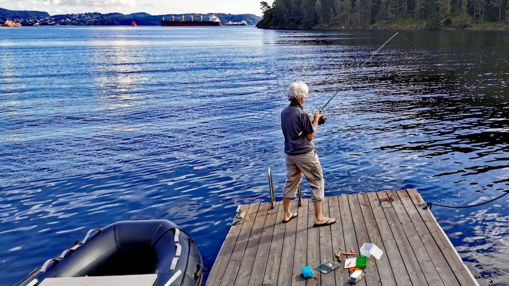 Bis eines Morgens die Neugier stärker war als die Zweifel. Ich schnappte mir das Meeresufergerät, stieg die lange Holztreppe hinunter und begann – einfach so – zu angeln. Keine Strategie, keine Erwartung. Nur Lust auf Wasser, Bewegung und das Klingen der Rute. Ich fächerte verschiedene Tiefen ab, spielte mit der Köderführung und war überrascht, wie lebendig die Bucht war: kleine Wittlinge, dicke Makrelen und sogar ein kleiner Lachs gingen an den Haken. Kein Rekordfang, aber ein Tag voller kleiner Erfolge – und das Gefühl, dass Angeln in der Flakvarbukta bei Skien mehr sein kann, als man auf den ersten Blick vermutet.